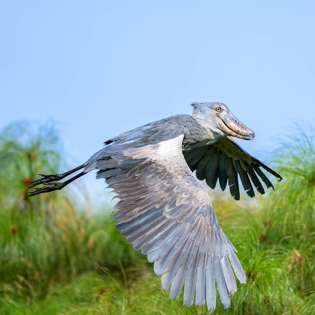 A prehistoric-looking marvel, the elusive shoebill stork, can be spotted with its massive beak in the papyrus swamps of Uganda’s Mabamba Swamp, Lake Mburo National Park, Murchison Falls National Park, and along the shores of Lake Albert and the Nile Delta. In Rwanda, they are occasionally seen in the wetlands of Akagera National Park. These fascinating wading birds feed on fish and other aquatic creatures, making them a unique sight for bird enthusiasts.